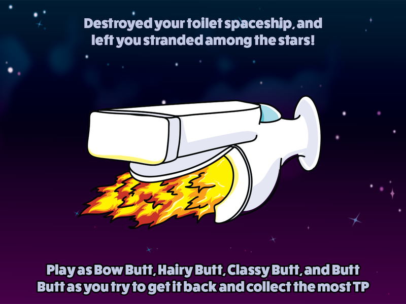"A hilarious game that starts with a serious problem: ~Evil Butt~ has stolen all the toilet paper in the universe and destroyed your toilet space ship!"