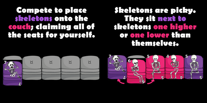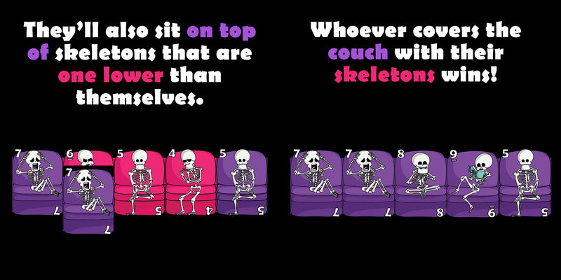 🦴These spooky sassy skeletons are looking for a couch to crash on! Be the first player to fill the couch seats with your skeletons by placing them according to their numbers.